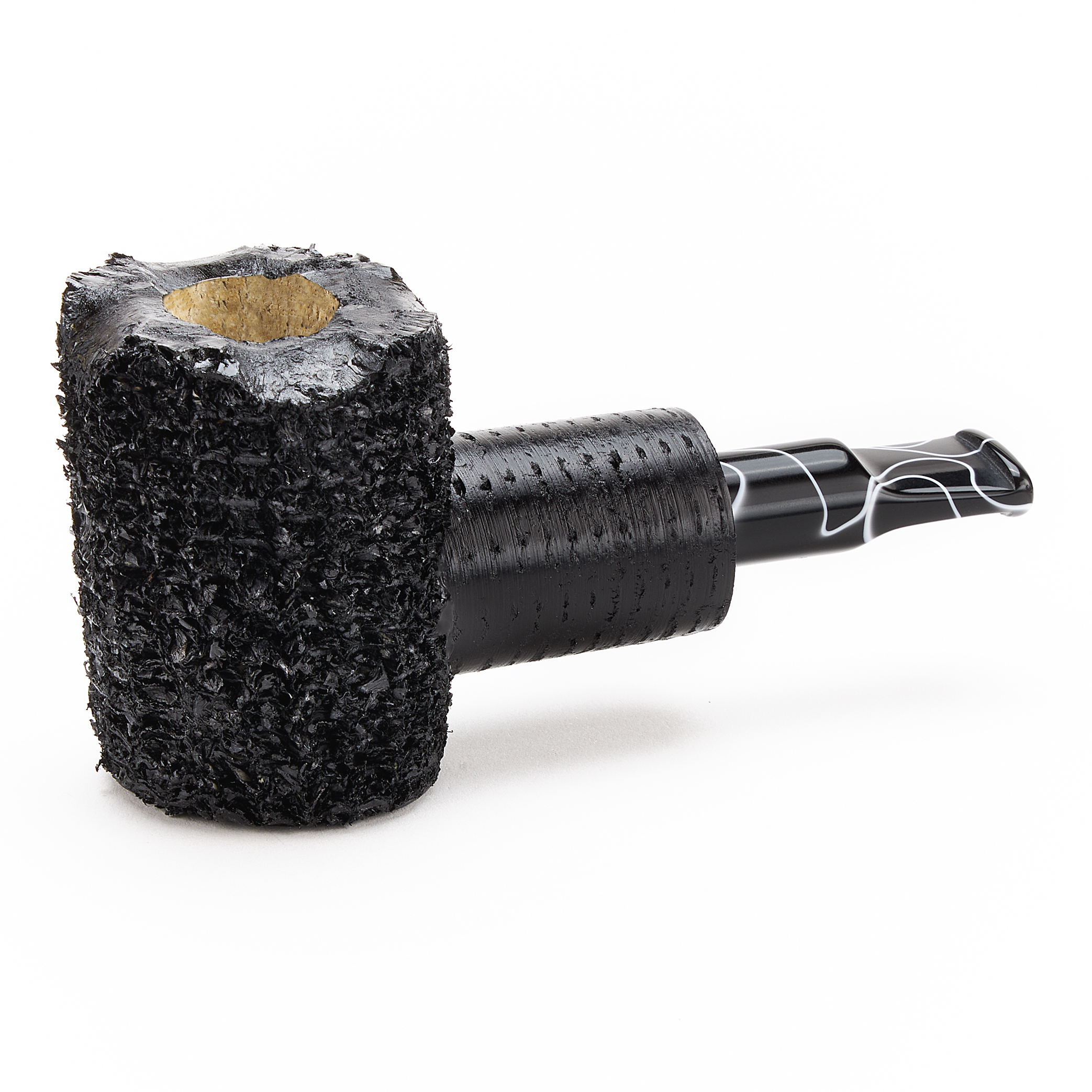 The Maximus commands attention as a daring reverse calabash. This ebony-black cob, artfully rusticated around the rim, delivers both presence and power. Topped with a striking black-and-white Italian acrylic bit, it’s a pipe built not just to be smoked—but to be admired.
